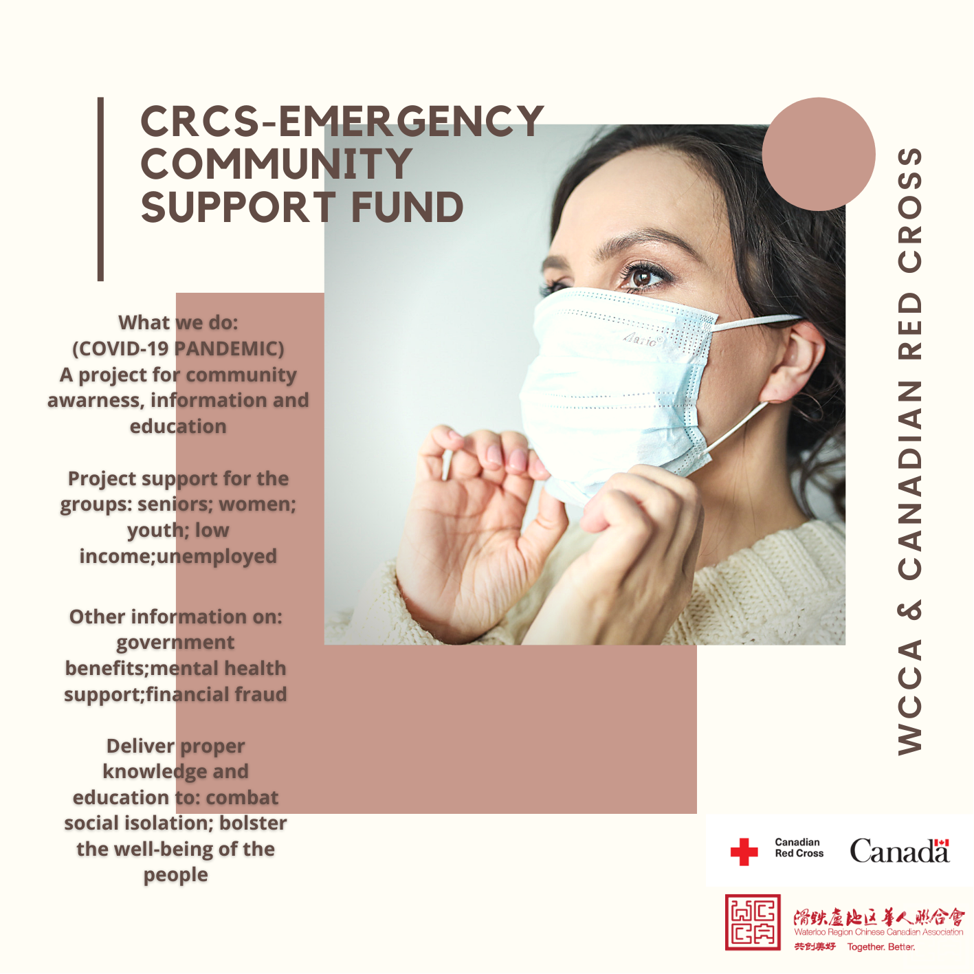 The project's purpose is to deliver weekly meetings for individuals in the Waterloo region and to mitigate risk and impact, prevent their social isolation due to COVID-19 pandemic. It covers essential information about government benefits, mental health support, financial fraud, etc. .Position opening as follows, - Project coordinator (1) Job description: Maintaining and monitoring project plans, project schedules, work hours, budgets and expenditures. Organizing, attending and participating in each group/club meetings. Documenting and following up on important actions and decisions from meetings. Undertaking project tasks as required. - Group leader (2): Job description: Group Leaders are responsible for leading a team of Program Aides to assist them in implementing program activities. They are also responsible for supervising, and being a good role model for, people enrolled in the program. Volunteers (20): Please send your resume to SOS@waterloocca.com |