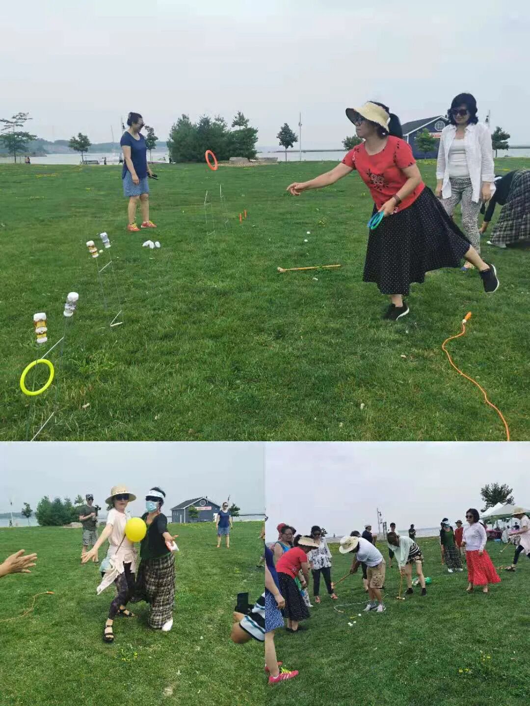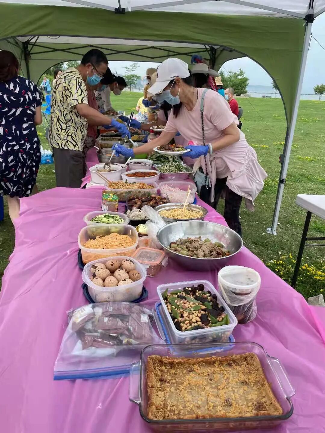 上午11点以后,各车队经两小时的旅途,陆续到达集合地,大家极为兴奋地聚集在环境优美的沙滩侧草坪,开始了我们的一日游。大家七手八脚搭起了帐篷,摆好了丰盛的百家宴,打起横幅以后,先照集体照。本次活动有幸由林峰带来的无人机为我们拍摄。 团员们在一起分享做美食的心得及做法,地瓜饼、饺子、春卷、炸茄盒、韭菜盒子、烤年糕等等,这些传统的亚洲美食。团员们带来了自家菜園的蔬菜:黃瓜、西紅柿、马齿苋、豆角, 健康的有机美味佳肴。